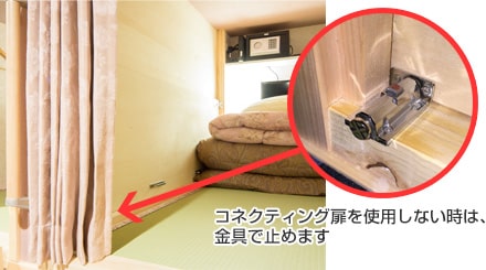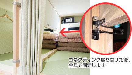ホステルわさび名古屋駅前では、隣との仕切り壁を上下にスライド可能な可動壁にすることで、2つの個室を1つの部屋として使用することができるようになりました。